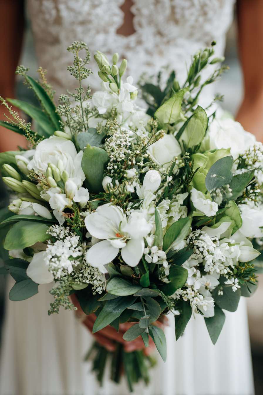 Combining white orchids with soft green foliage creates a stunning bouquet that stands out beautifully against a wedding gown. The delicate textures of orchids juxtaposed with rich greenery echo both elegance and freshness, making a statement that is both modern and timeless.