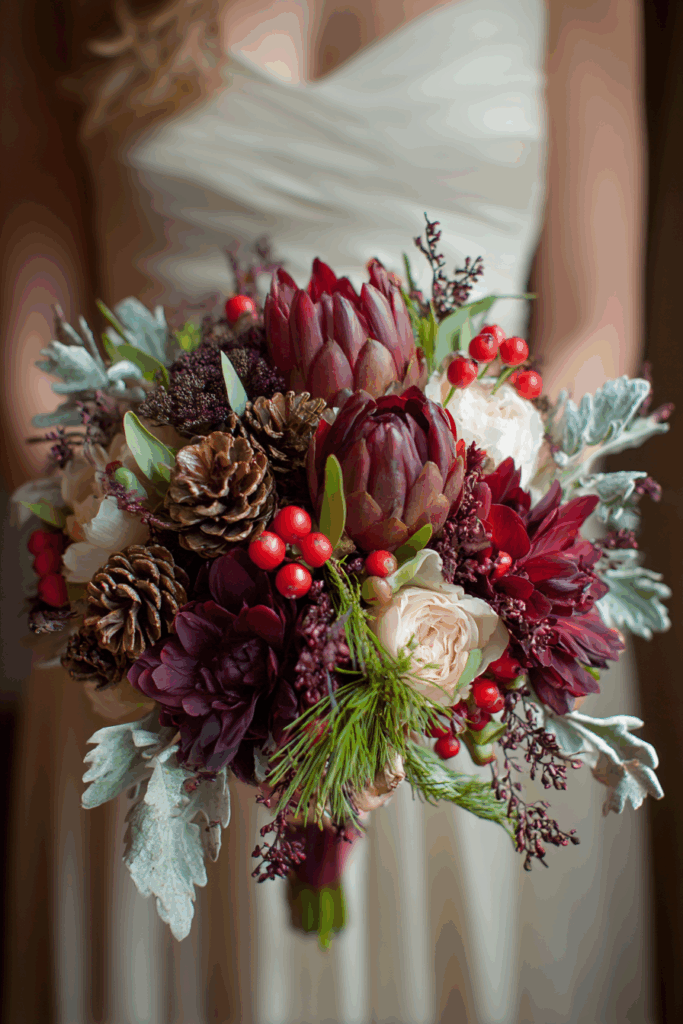 For a cozy, rustic touch, consider a bouquet that combines pine branches, red berries, and white blooms. This arrangement captures the spirit of the holidays while remaining sophisticated and elegant. The natural elements not only add a seasonal feel but also the delightful scent of pine that can enhance the wedding experience.