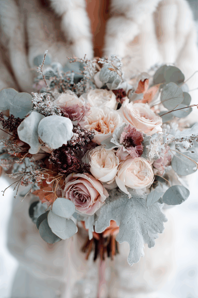 Infuse a modern touch with a bouquet featuring silver and blue eucalyptus. The foliage, with its soft, muted tones and unique textures, creates a serene palette that captures the essence of winter. Add in some whimsical white blooms, like anemones or snowdrops, to accentuate the elegance of the eucalyptus and create a fresh, airy feel.
